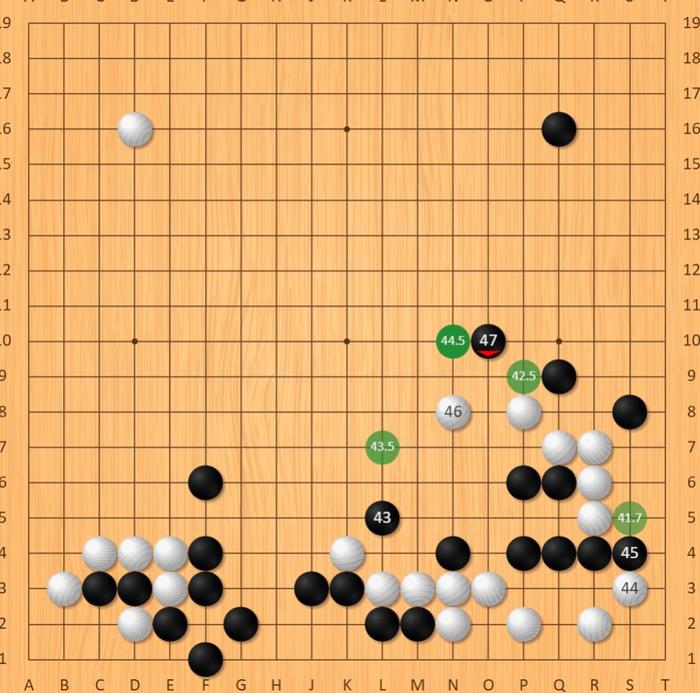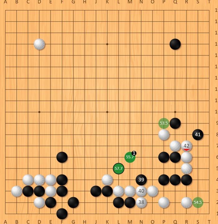 白棋38手和40手粘未能走出最强的一选,这让黑棋占到便宜。屠晓宇则乘胜追击,在中腹打入之后,让申真谞九段陷入了长考!可以说,黑棋在布局上十分成功!