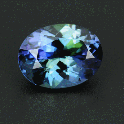 一颗天然未经热处理的坦桑石的三色性,如教科书般的蓝色-紫色-黄绿色的变化