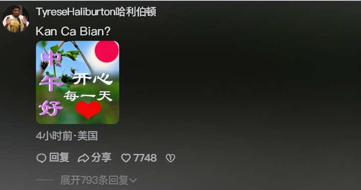 对此,步行者核心哈利伯顿用拼音幽默回复:“Kan Ca Bian?(看擦边?)”凯尔特人核心塔图姆则是推荐了该条视频。