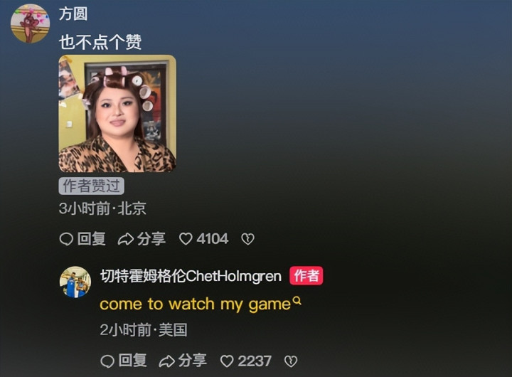 对此,该女网红方圆在评论区留言表示:“也不点个赞。”霍姆格伦回复表示:“来看我比赛。”