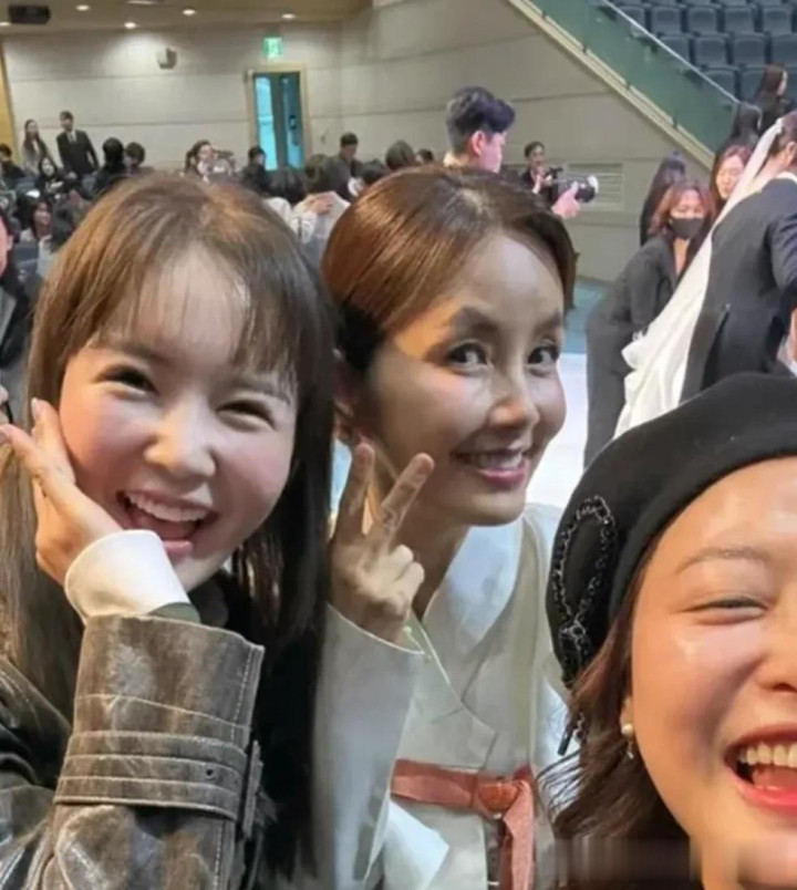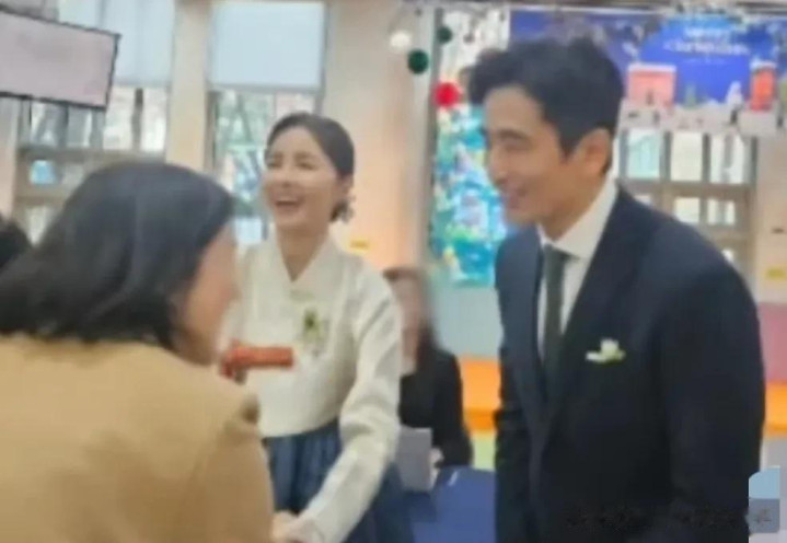 作为父母的申爱罗和车仁表盛装出席,车仁表一身藏蓝色西装,佩戴胸花和白手套,依然帅气。申爱罗身穿韩服,扎着低丸子头,笑意盈盈,看着特别和善。