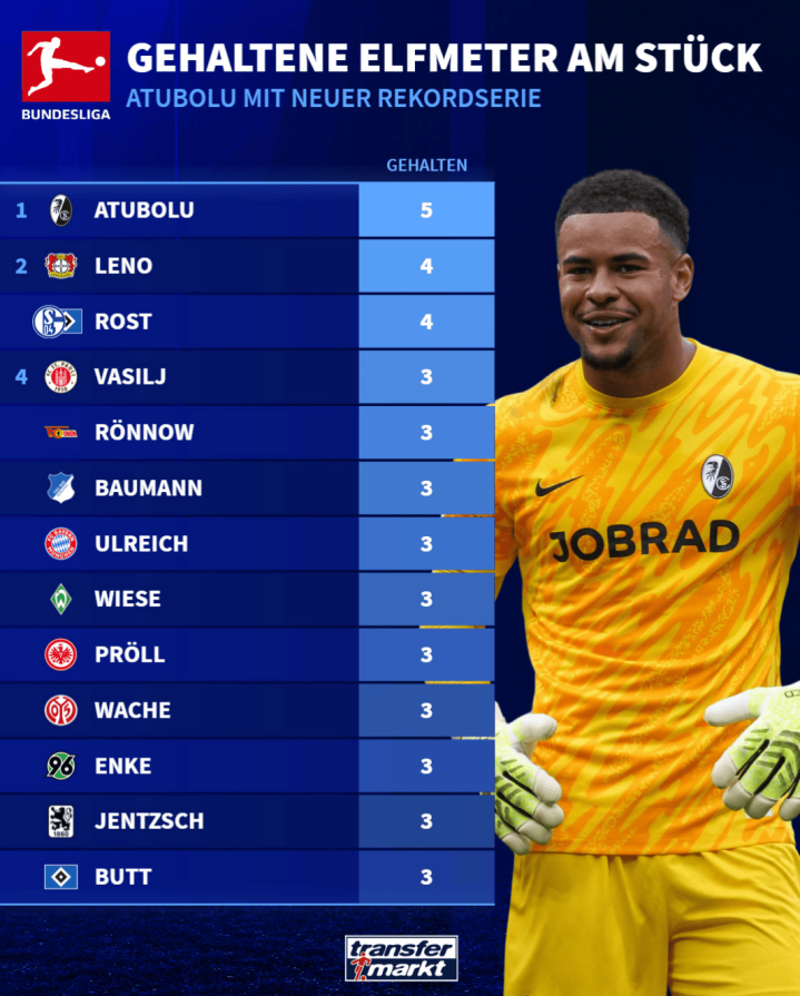 这是他联赛中连续5次扑出点球,从而打破了莱诺和罗斯特共同保持的连续4次扑出点球的德甲纪录。