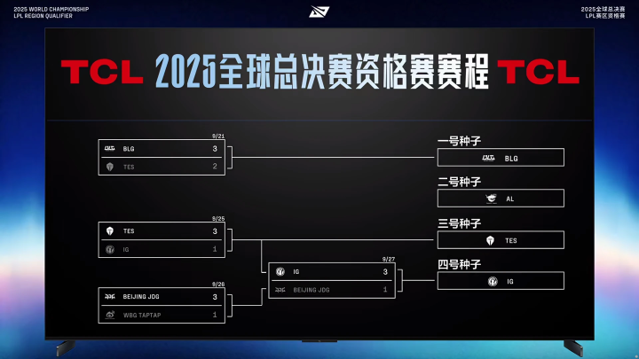 IT之家9月27日消息,在今天举行的2025全球总决赛LPL赛区资格赛第三日比赛中,iG战队在被JDG先下一局的情况下迅速调整,连追三场,最终锁定四号种子席位。至此,LPL赛区四个种子名额均已出炉,分别为BLG、AL、TES和iG。